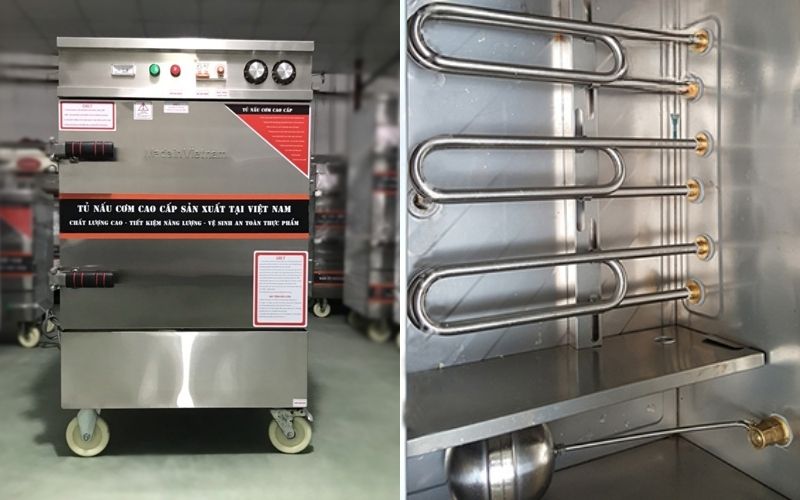 Cấu trúc tủ dạng hình hộp đứng, thiết kế kín, giúp giữ nhiệt tốt và hạn chế thất thoát hơi nước ra bên ngoài. Hệ thống khay hấp được bố trí khoa học, khoảng cách các khay hợp lý để hơi nước lưu thông đều từ dưới lên trên.