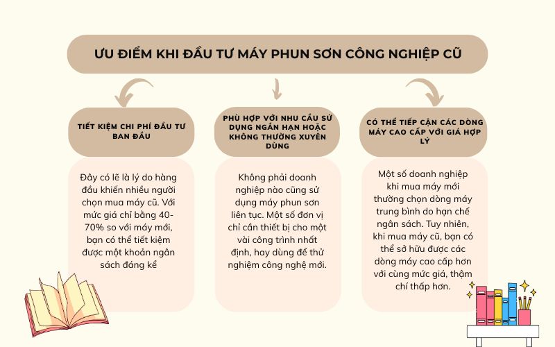 Với những đơn vị có ngân sách hạn chế, hoặc chỉ cần sử dụng máy trong một khoảng thời gian ngắn, việc lựa chọn máy cũ trở thành giải pháp kinh tế. Nhưng đi kèm với lợi ích về chi phí là những mối lo về độ bền, hiệu suất và hậu mãi. Để đánh giá một cách khách quan nhất, chúng ta hãy cùng nhìn vào từng khía cạnh cụ thể.2. Ưu điểm khi đầu tư máy phun sơn công nghiệp cũ