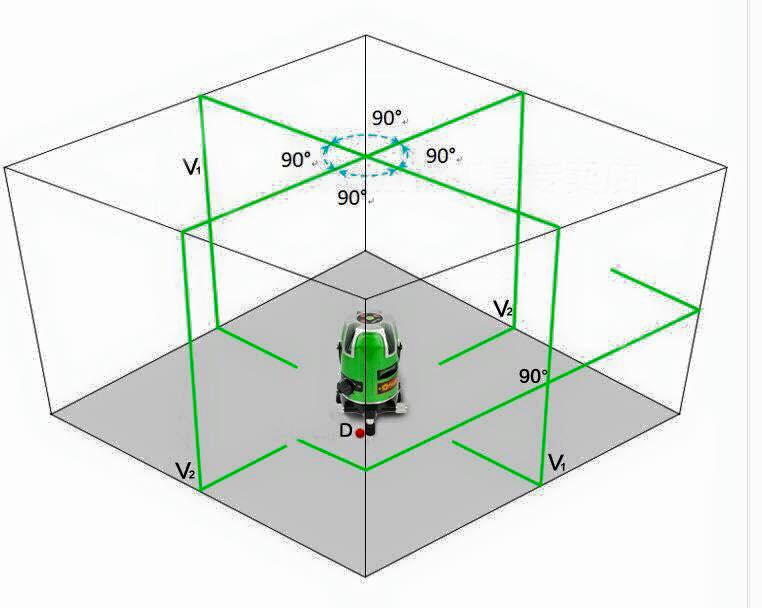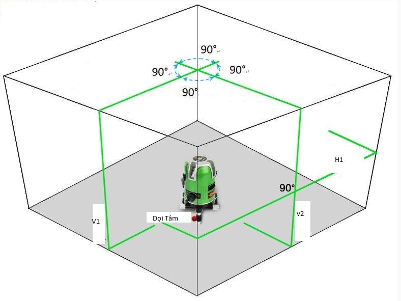 Cơ chế hoạt động:Thiết bị gồm 4 tia bao gồm 2 tia đứng, 1 tia ngang và 1 tia dọi tâm với cường độ tia là 10mw. Máy có phạm vi đo từ 0,05 đến 10m và độ chính xác là ± 1.0 mm/5m, máy có thể tự động cân bằng trong khoảng 5 độ.