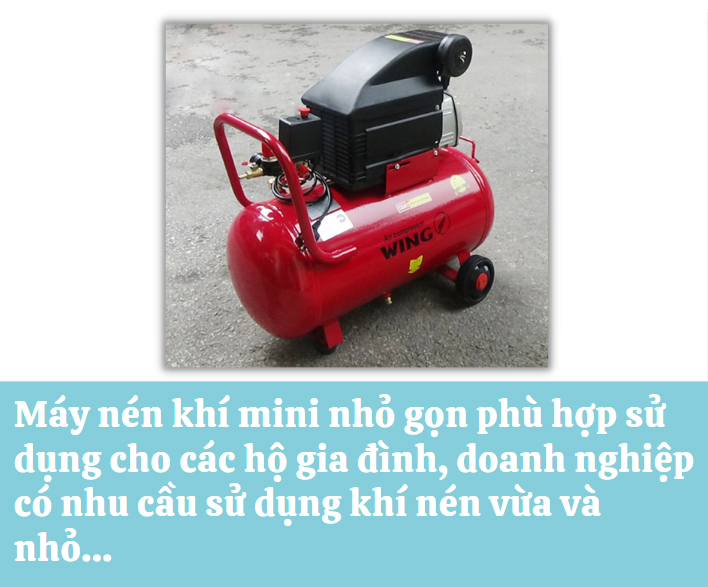 Máy nén khí miniđược sử dụng để nén không khí với đặc điểm là gọn nhẹ với mức công suất nhỏ hơn hoặc bằng 2HP. Máy có mức giá thành thấp hơn so với các sản phẩm máy nén khác. Với mức công suất và giá thành tương đối rẻ này, thì máy thực sự phù hợp với các hộ kinh doanh quy mô nhỏ lẻ, quy mô gia đình.