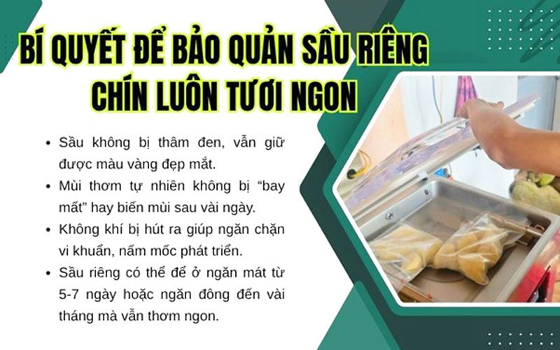 Đặc biệt, khi được hút chân không, sầu riêng có thể để ở ngăn mát từ 5-7 ngày hoặc ngăn đông đến vài tháng mà vẫn thơm ngon, đảm bảo an toàn cho sức khoẻ người dùng.